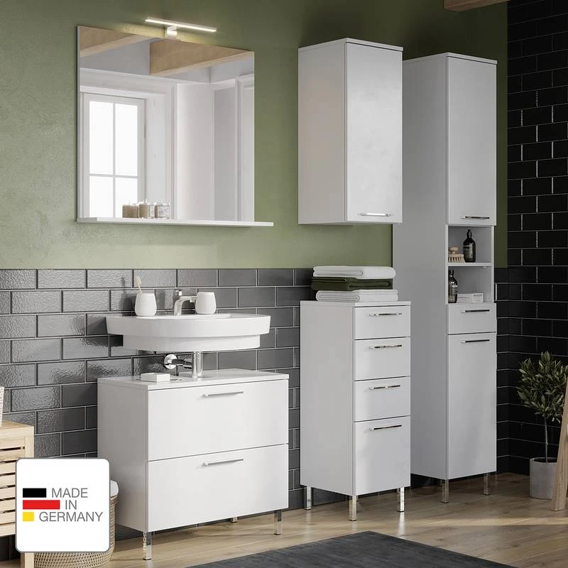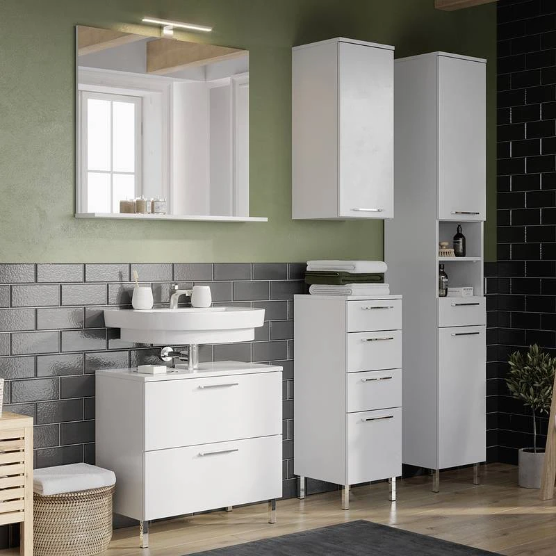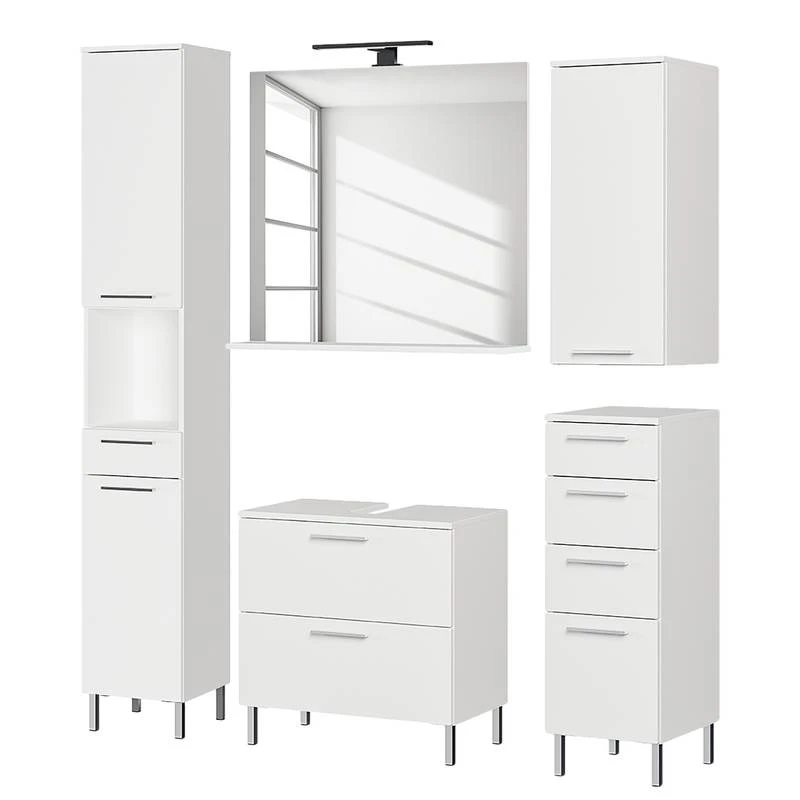 - Contenu de la livraison : Ensemble de salle de bain comprenant 1 meuble sous lavabo, 1 colonne de salle de bain, 1 meuble bas,1 meuble haut et 1 miroir avec éclairage
