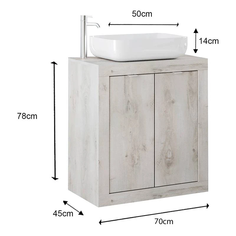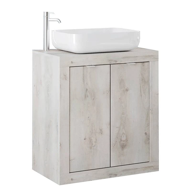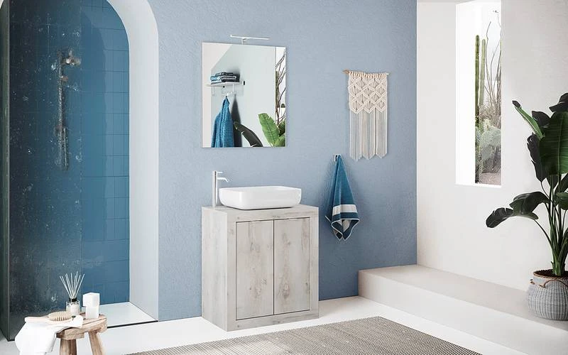 - Contenu de la livraison : Salle de bain comprenant 1 miroir avec éclairage et 1 meuble avec vasque en céramique, sans accessoires
