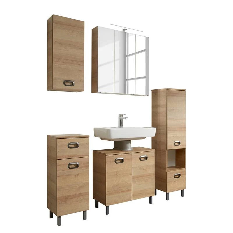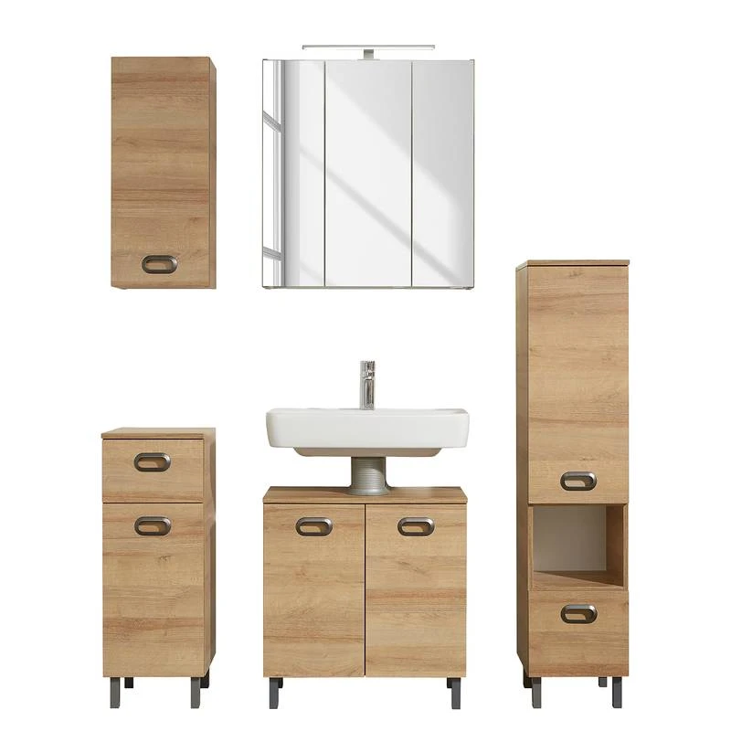 - Contenu de la livraison : Ensemble de salle de bain comprenant 1 meuble sous lavabo, 1 armoire de salle de bain, 1 meuble bas, 1 meuble haut et 1 armoire de toilette avec éclairage