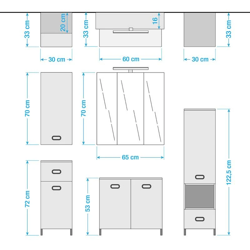 - Armoire de toilette (LxHxP) : 65 x 70 x 16 cm