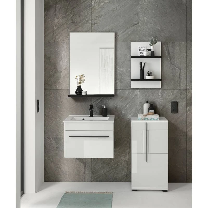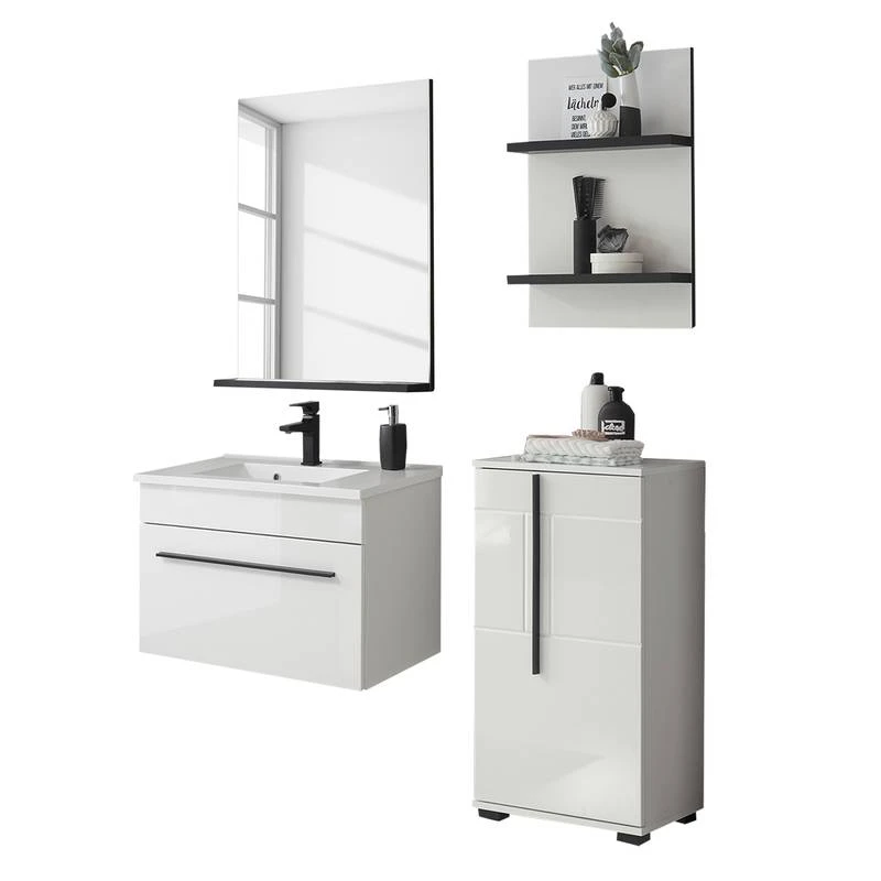 - Contenu de la livraison : Salle de bain comprenant 1 meuble avec vasque en fonte minérale, 1 meuble bas (charnières à droite), 1 étagère murale et 1 miroir