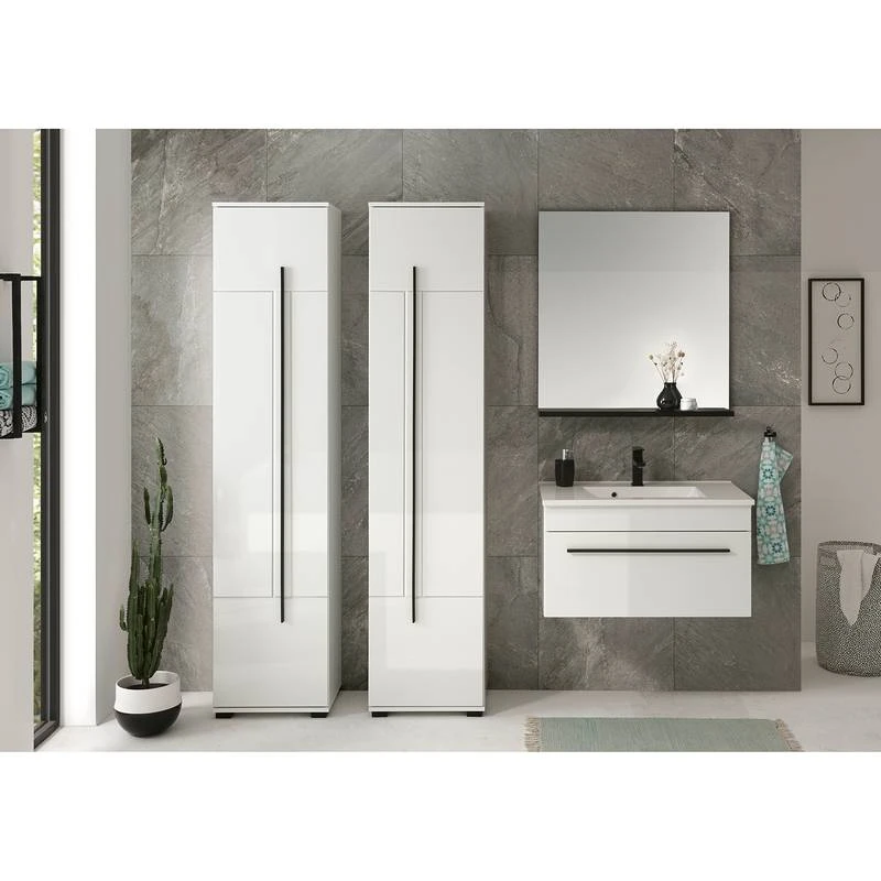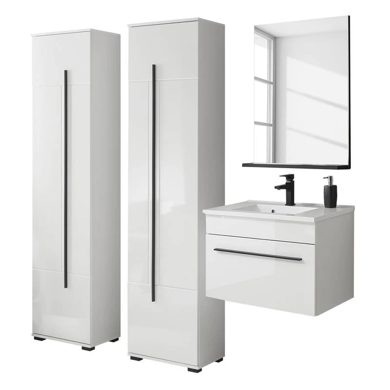 - Contenu de la livraison : Salle de bain comprenant 1 meuble avec vasque en fonte minérale, 1 colonne de salle de bain (charnières à gauche), 1 colonne de salle de bain (charnières à droite) et 1 miroir