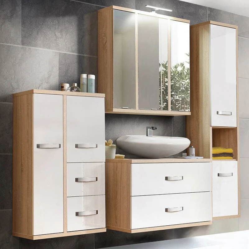 - Contenu de la livraison : Ensemble de salle de bain comprenant 1 armoire de salle de bain, 1 meuble sous lavabo, 1 colonne de salle de bain et 1 armoire de toilette avec éclairage