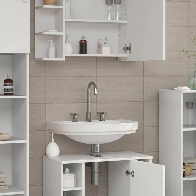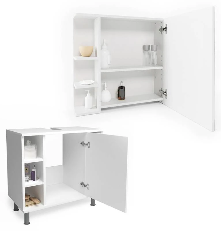 - Contenu de la livraison : • 1x armoire de toilette• 1x meuble sous-vasque Décoration non incluse