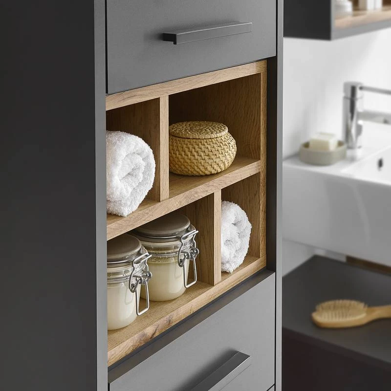 - Contenu de la livraison : Salle de bain comprenant 1 colonne de salle de bain, 1 meuble sous lavabo et 1 armoire de toilette avec éclairage LED, interrupteur et prise (température de couleur : blanc froid)