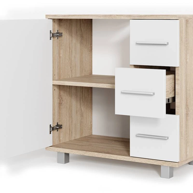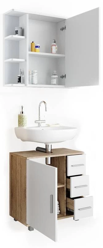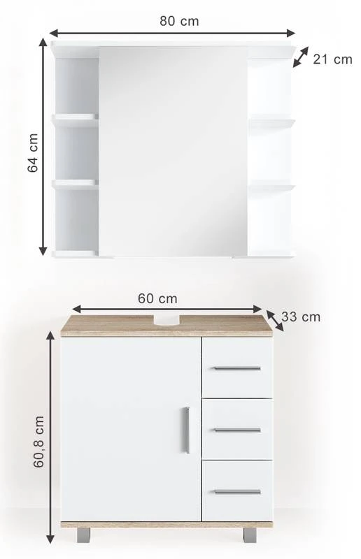 - Contenu de la livraison : • 1x armoire de toilette • 1x meuble sous-vasque Décoration non incluse