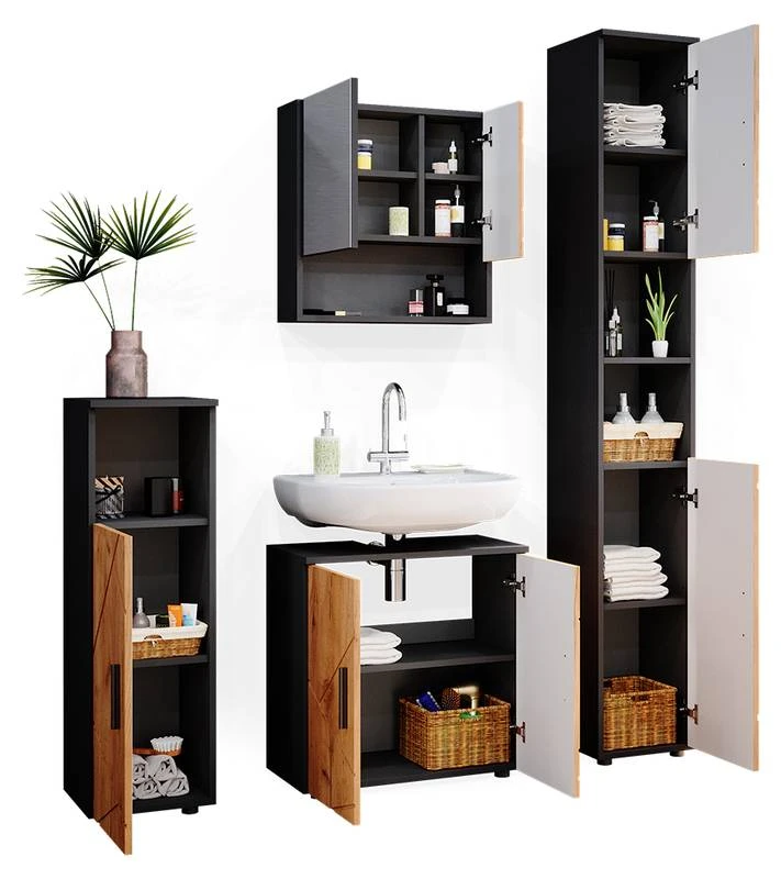 - Contenu de la livraison : • 1x meuble sous-vasque• 1x armoire de toilette • 1x chiffonnier• 1x meuble suspendu• 1x placardDécoration non incluse