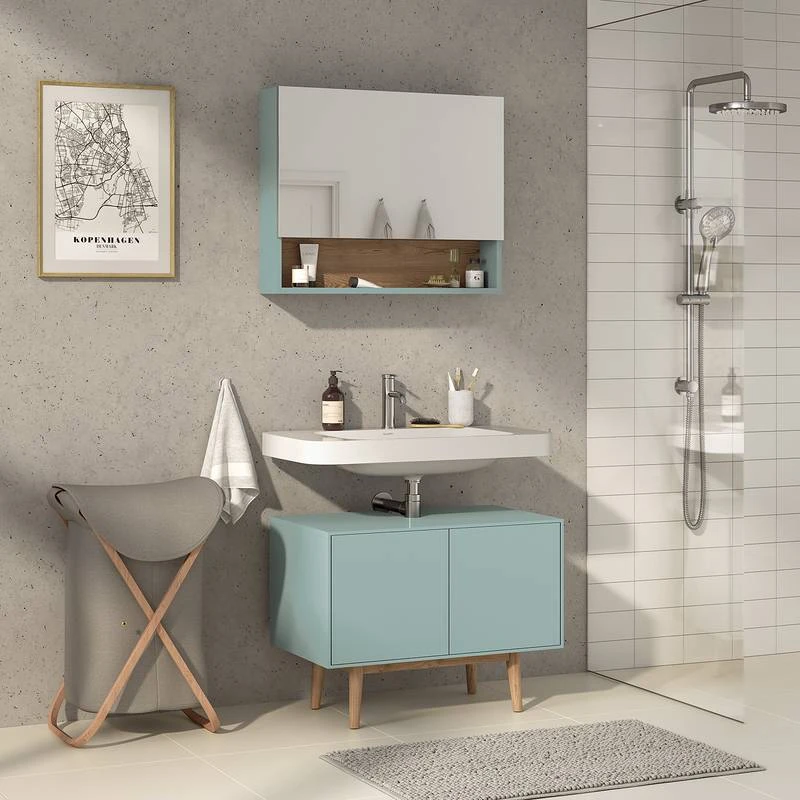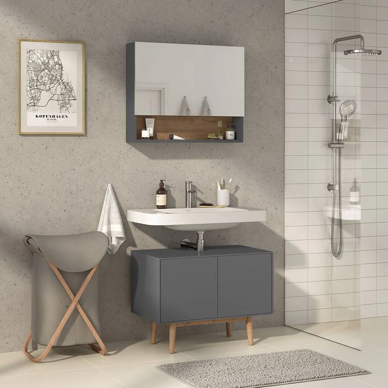 - Contenu de la livraison : Ensemble de salle de bain comprenant 1 meuble sous lavabo et 1 armoire de toilette avec porte relevable