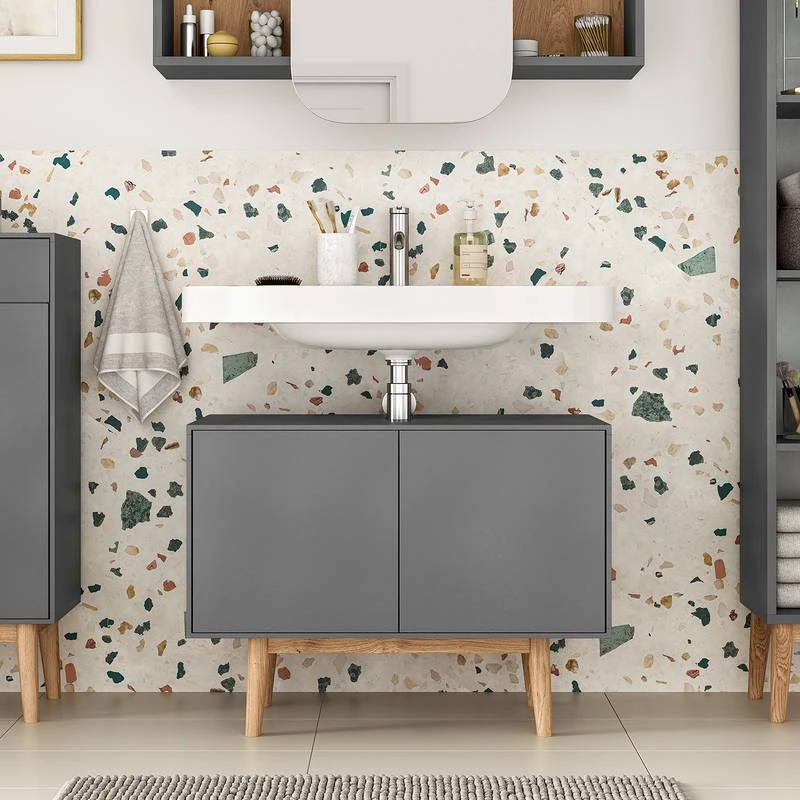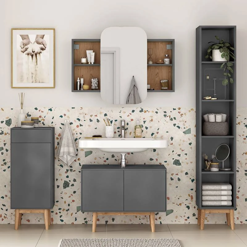 - Contenu de la livraison : Ensemble de salle de bain comprenant 1 meuble sous lavabo, 1 étagère, 1 meuble bas et 1 armoire de toilette