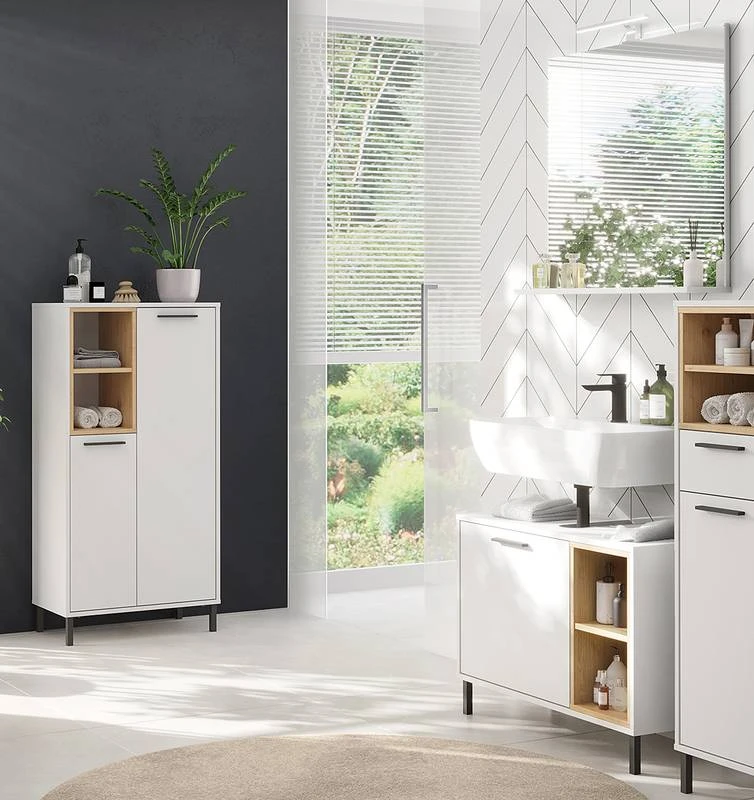 - Contenu de la livraison : Salle de bain comprenant 1 meuble sous vasque, 1 armoire midi et 1 miroir avec éclairage inclus, sans accessoires
