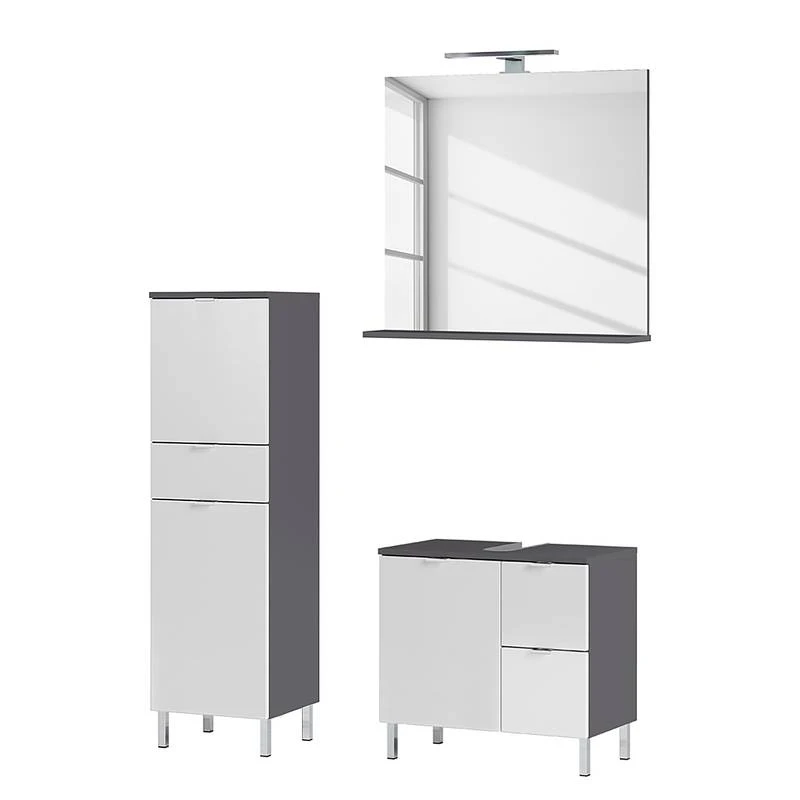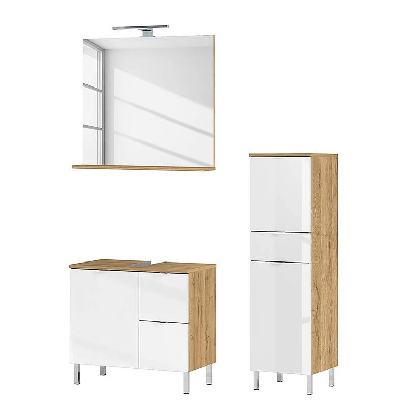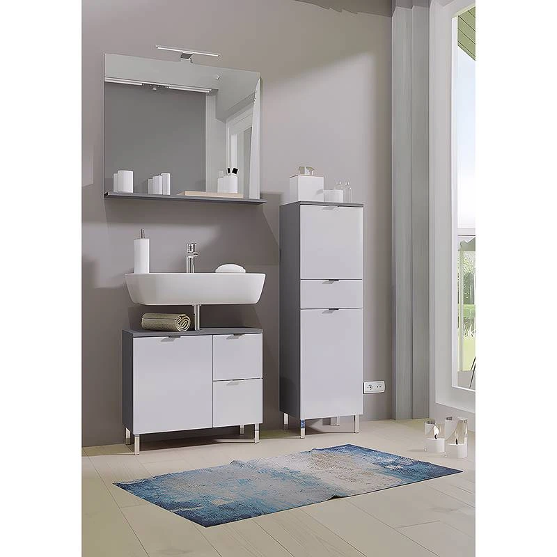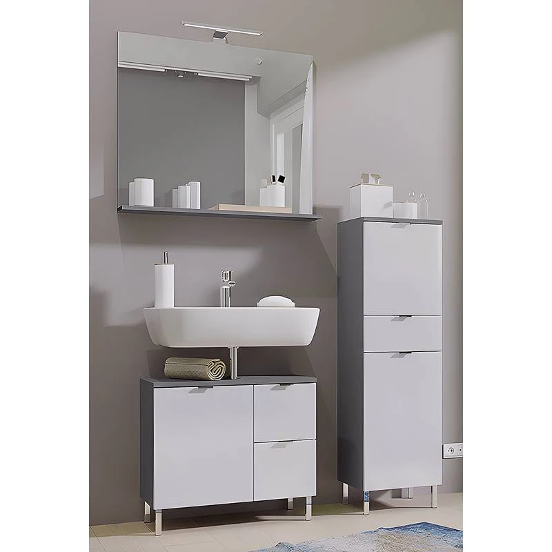- Contenu de la livraison : Salle de bain composée de 1 meuble sous vasque, 1 miroir avec éclairage inclus et 1 colonne de salle de bain, sans accessoires