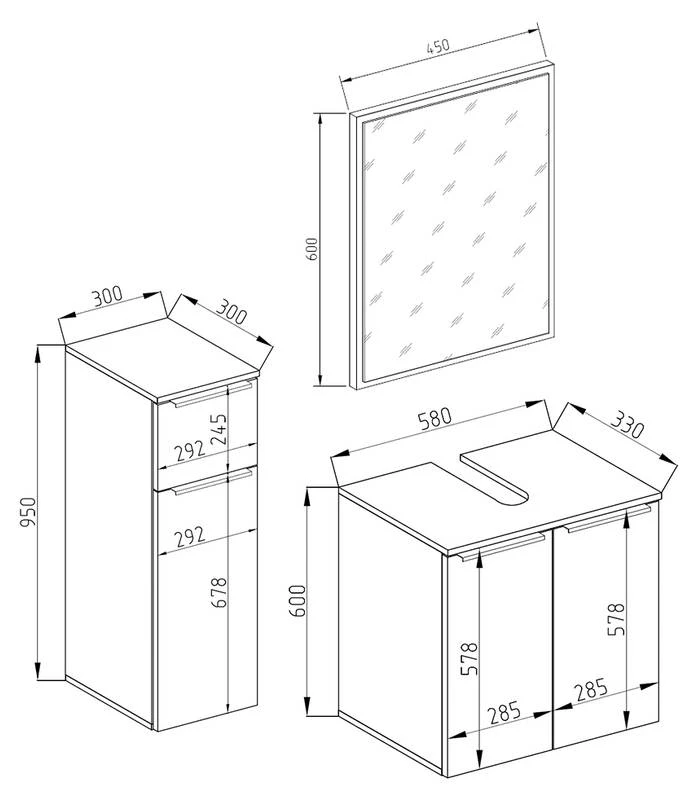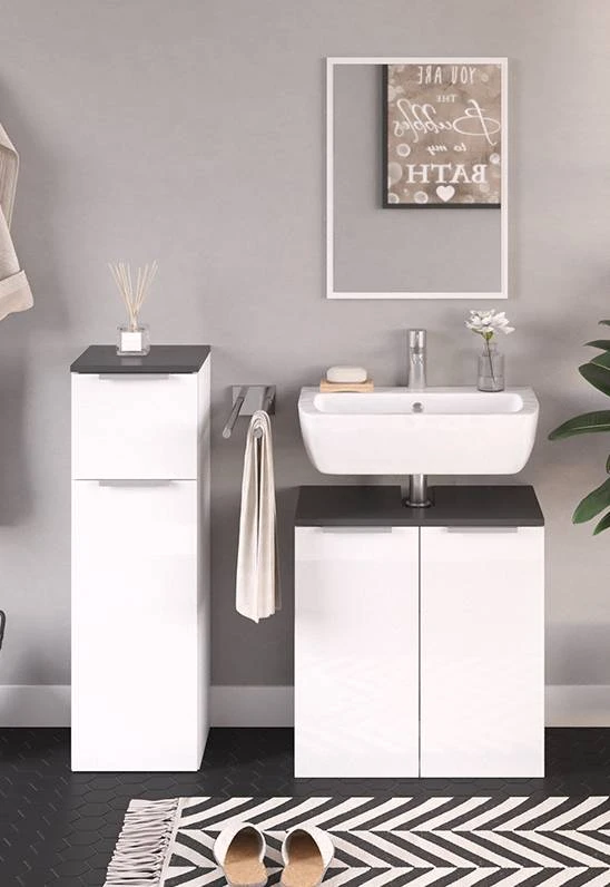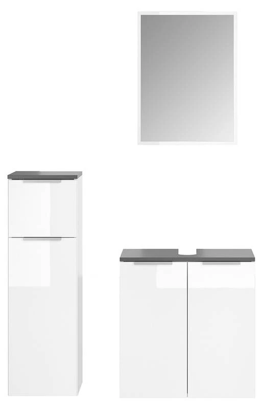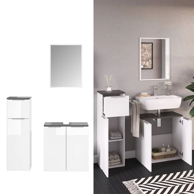 - Contenu de la livraison : Set 3 • 1x meuble sous-vasque • 1x miroir • 1x chiffonnier Décoration non incluse