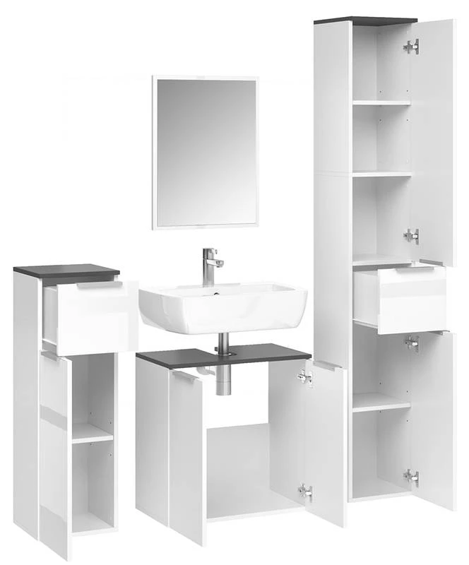 • Contenu de la livraison : Set 4 • 1x meuble sous-vasque • 1x chiffonnier • 1x meuble haut • 1x miroir Décoration non incluse