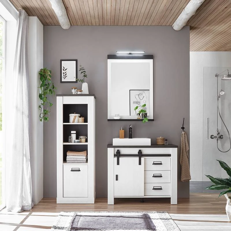- Contenu de la livraison : Salle de bain comprenant 1 miroir et 1 meuble avec vasque en fonte minérale, avec éclairage et sans accessoires