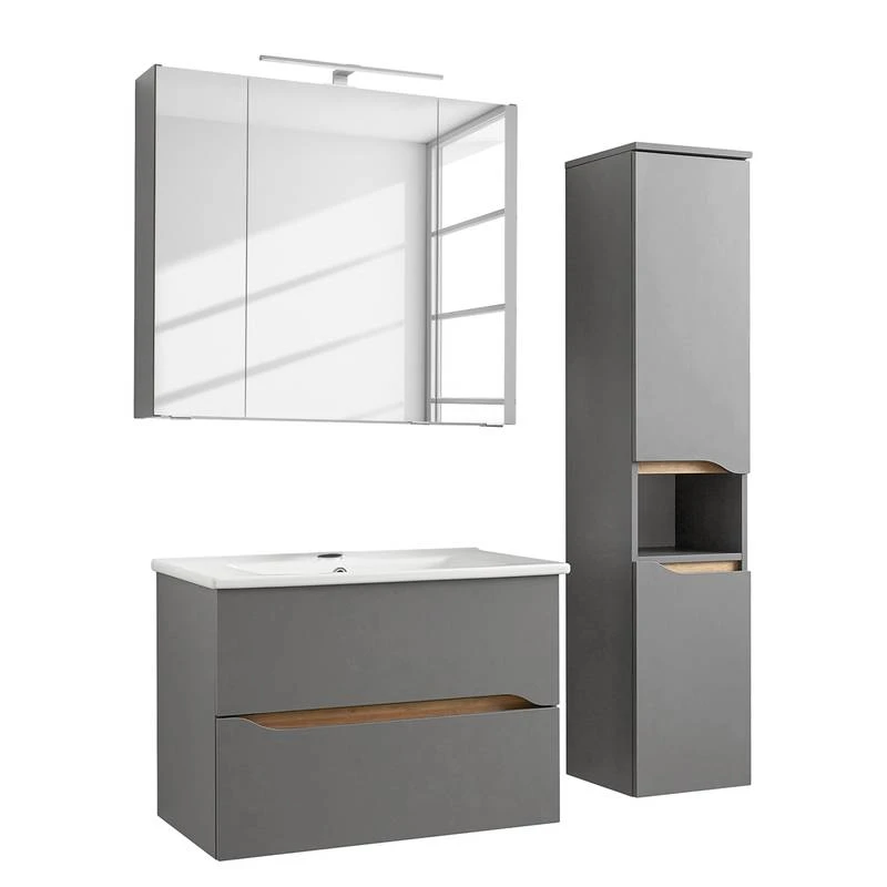 - Contenu de la livraison : Salle de bain comprenant 1 meuble avec vasque en céramique, 1 armoire de salle de bain et 1 armoire de toilette avec éclairage