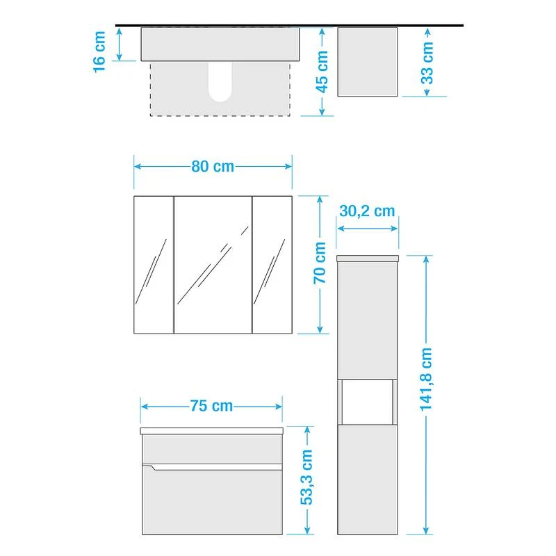 - Armoire de toilette (LxHxP) : 80 x 70 x 16 cm