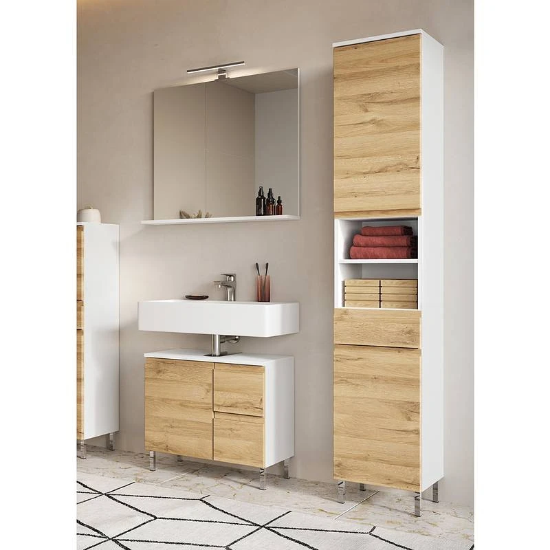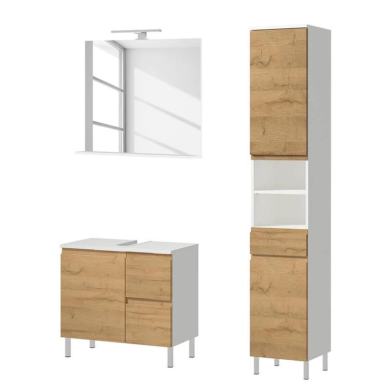 - Contenu de la livraison : Salle de bain comprenant 1 miroir avec éclairage, 1 meuble sous lavabo et 1 colonne de salle de bain, sans accessoires
