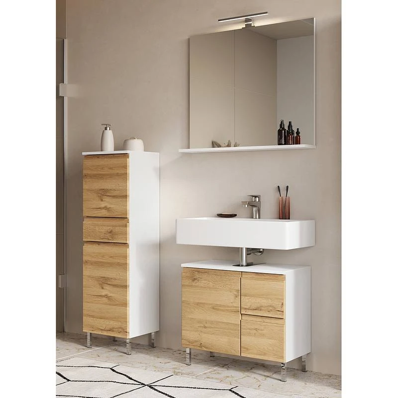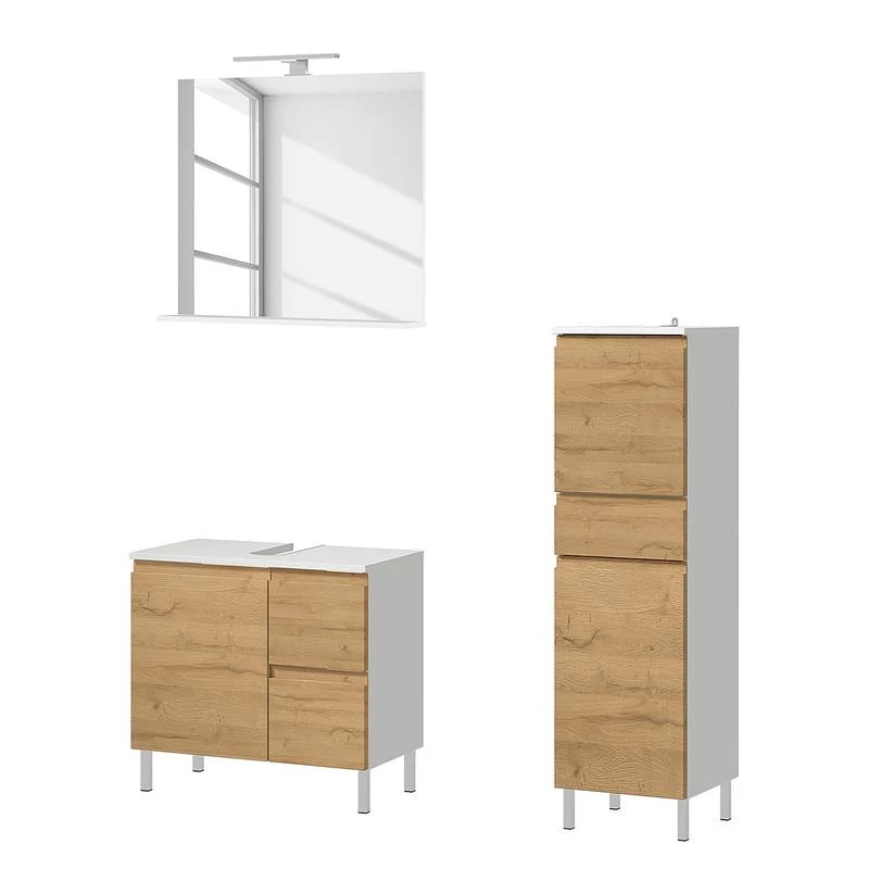 - Contenu de la livraison : Salle de bain comprenant 1 miroir avec éclairage , 1 meuble sous lavabo et 1 armoire de salle de bain, sans accessoires