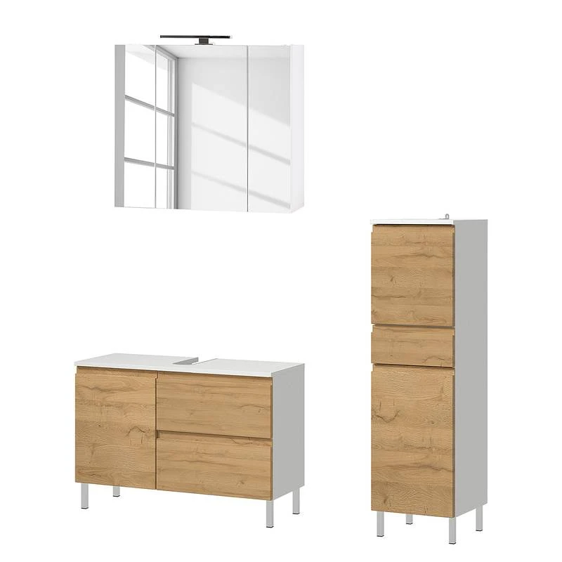 - Contenu de la livraison : Salle de bain comprenant 1 armoire de toilette avec éclairage , 1 meuble sous lavabo et 1 armoire de salle de bain, sans accessoires