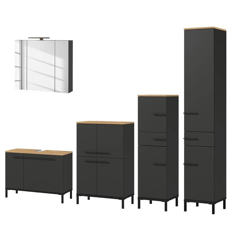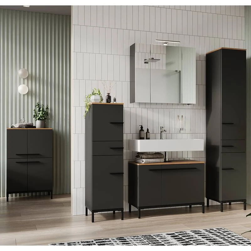 - Contenu de la livraison : Ensemble de salle de bain comprenant 1 meuble sous lavabo, 1 meuble bas, 1 colonne de salle de bain, 1 armoire midi et 1 armoire de toilette avec éclairage, interrupteur et prise