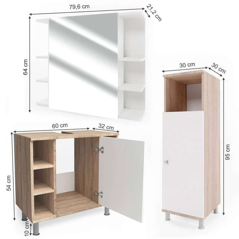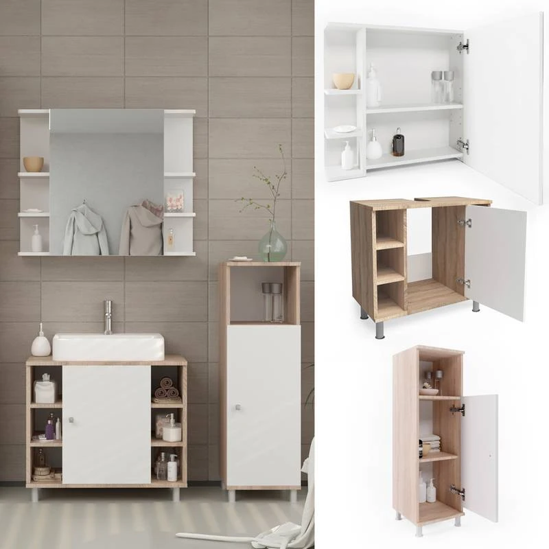 - Contenu de la livraison : • 1x armoire de toilette • 1x meuble sous-vasque • 1x chiffonnier Décoration non incluse