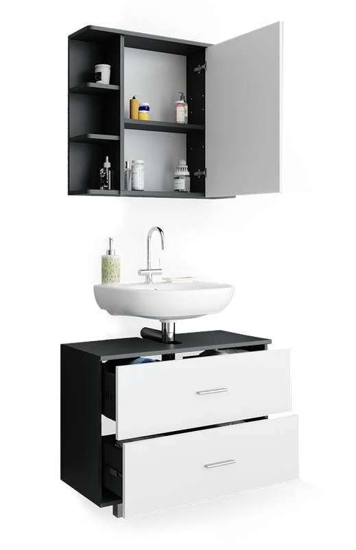 - Contenu de la livraison : • 1x armoire de toilette• 1x meuble sous-vasqueDécoration non incluse