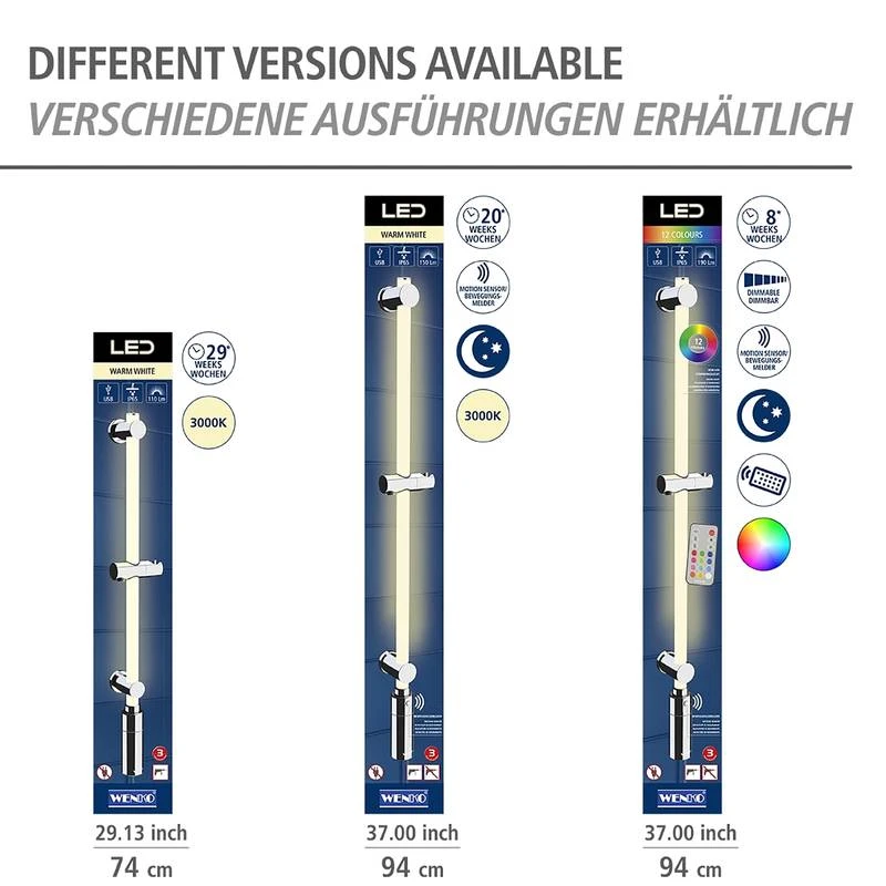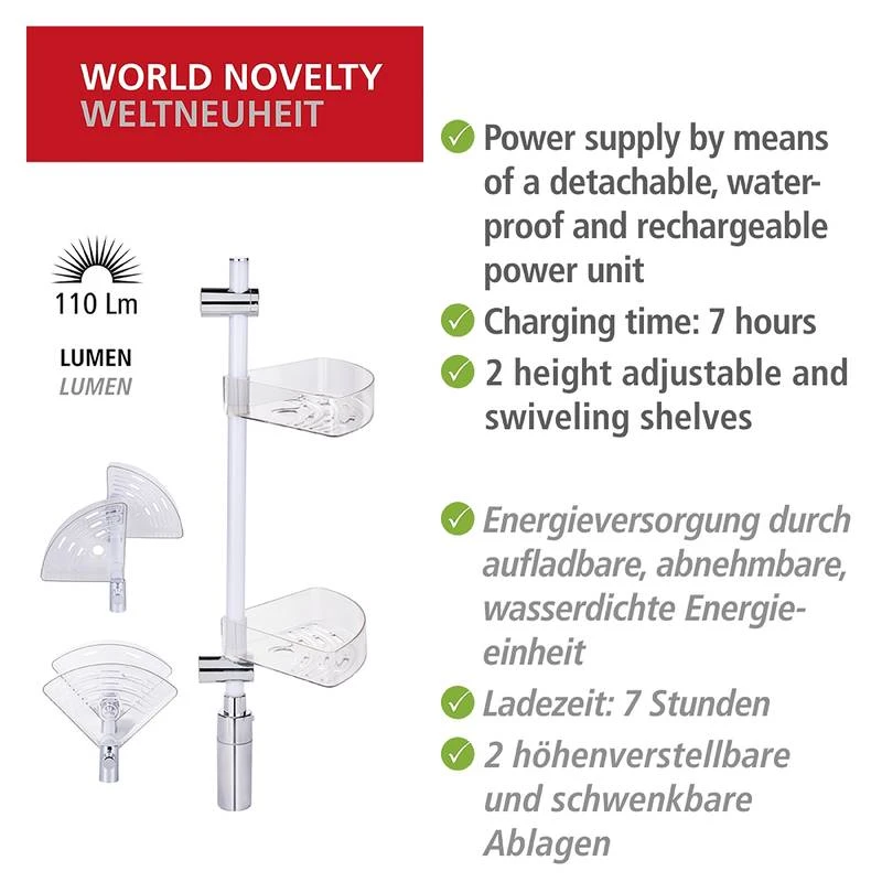 - Contenu de la livraison : Barre LED avec unité d’alimentation, 2 étagères, 2 supports muraux coulissants, câble USB, adhésif Power-Loc, vis et chevilles